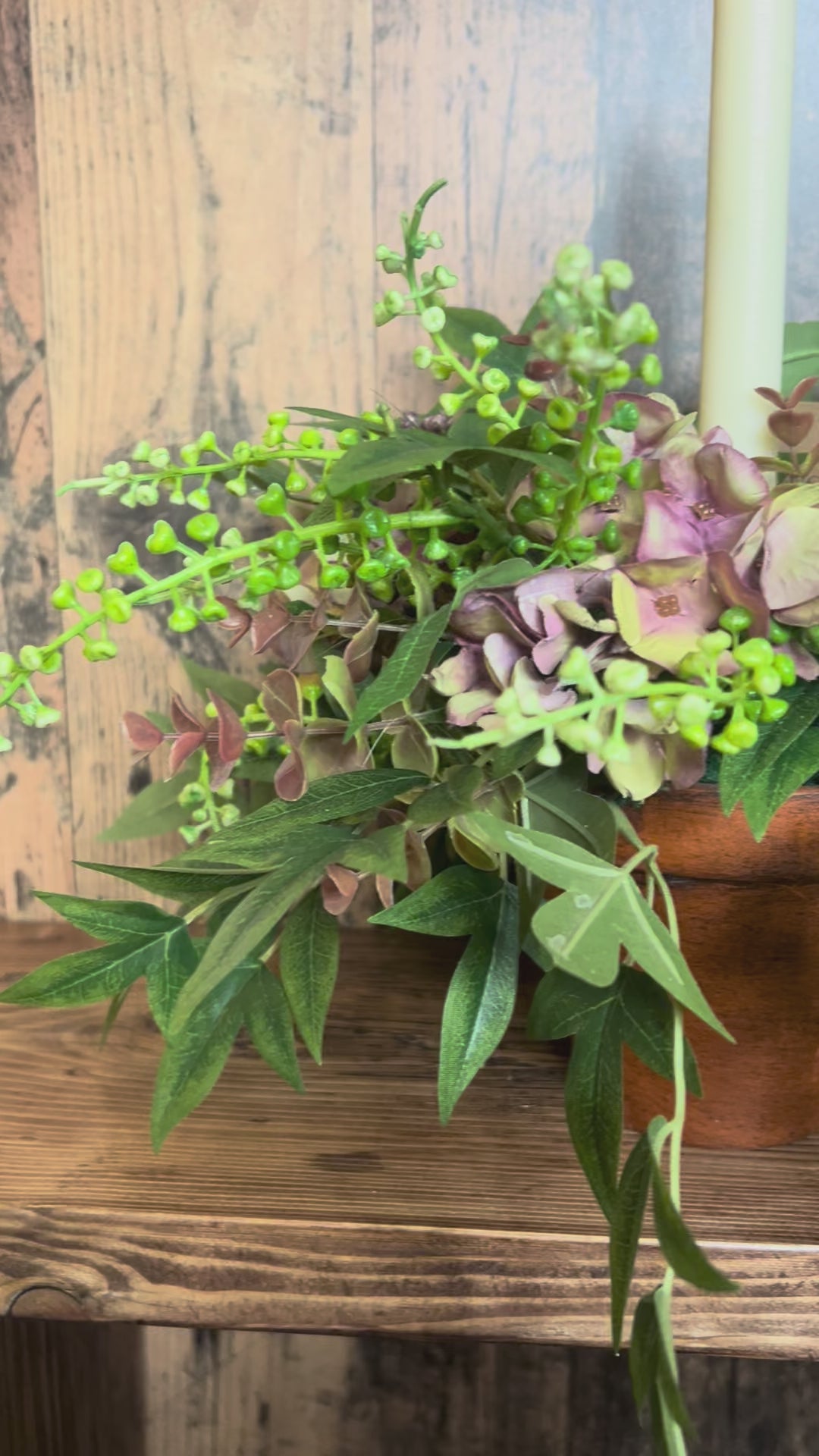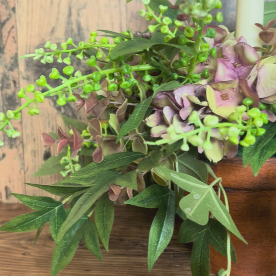 Featuring hydrangeas, seasonal greenery, and berries, it includes a battery-operated artificial wax touch candle (requires 2 AAA batteries) nestled in a terracotta pot, hand-distressed for a vintage appearance.