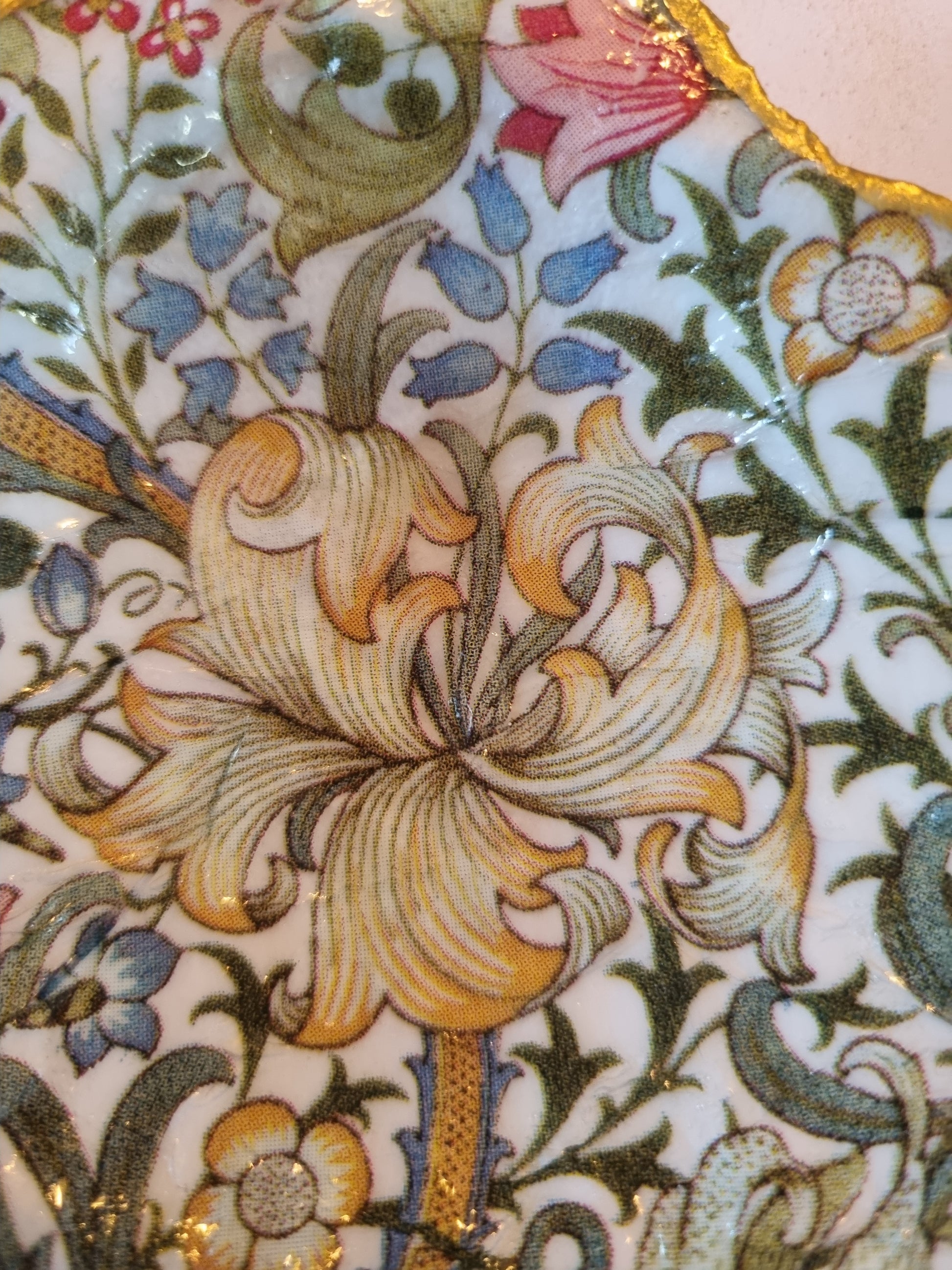 A delicate scallop shell dish. Each shell is carefully selected and hand-finished using decorative paper, this design features an intricate heritage-inspired botanical pattern with flowing foliage, soft florals and warm, muted tones.