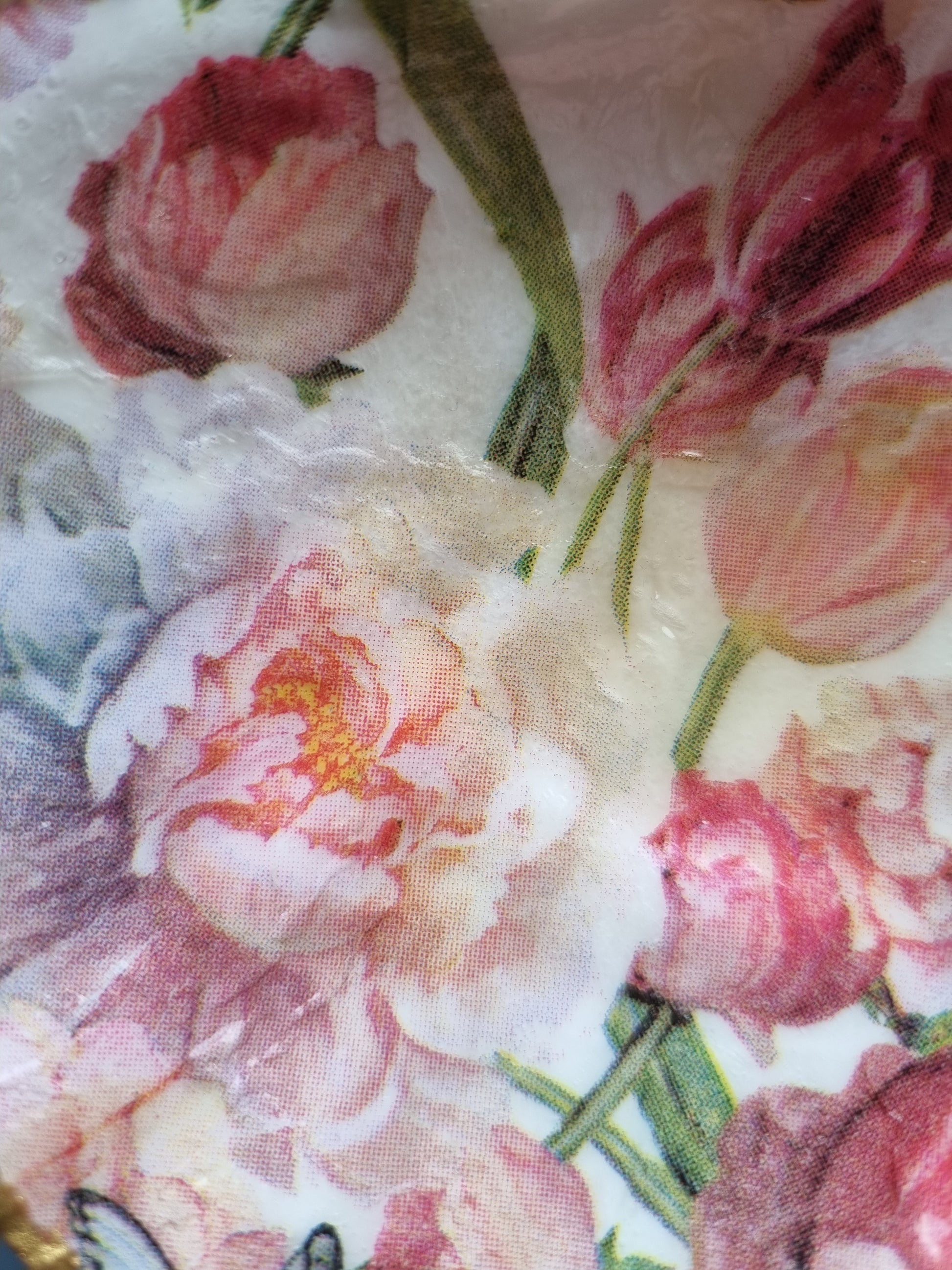 A delicate scallop shell dish. Each shell is carefully selected and hand-finished using decorative paper, this design features soft blush florals with delicate pinks, warm peach tones and gentle greenery, creating a romantic and elegant feel.