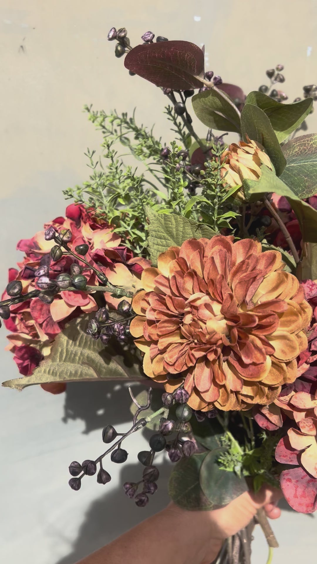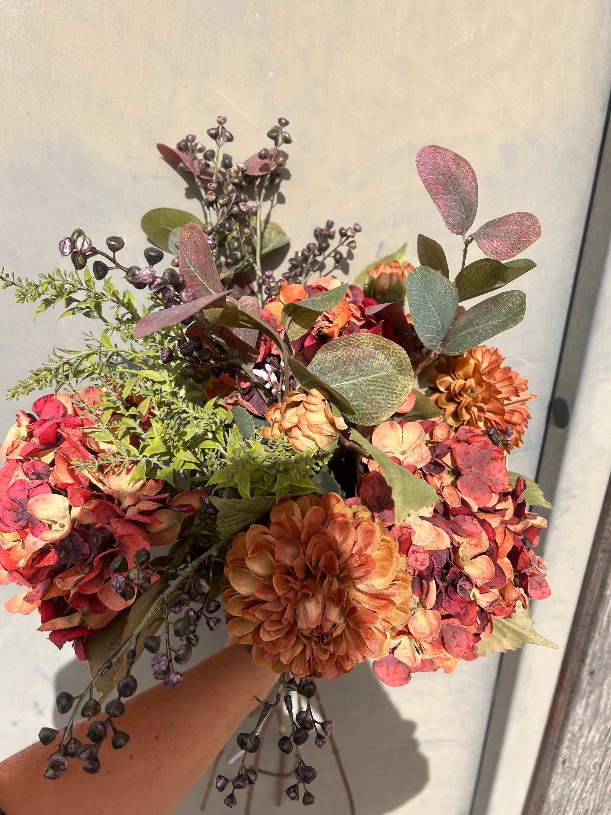 Winter Faux Flower Arrangement-Burnt Orange -Hydrangea, Winter Berry and Daliah