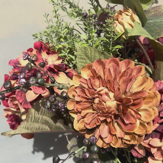This beautiful Autumn/Winter Faux Flower Arrangement is a stunning combination of deep burnt oranges and greenary. A mix of hydrangeas, daliahs, winter berries and greenary. This arrangement will add a beautiful warm touch to your home this Winter.